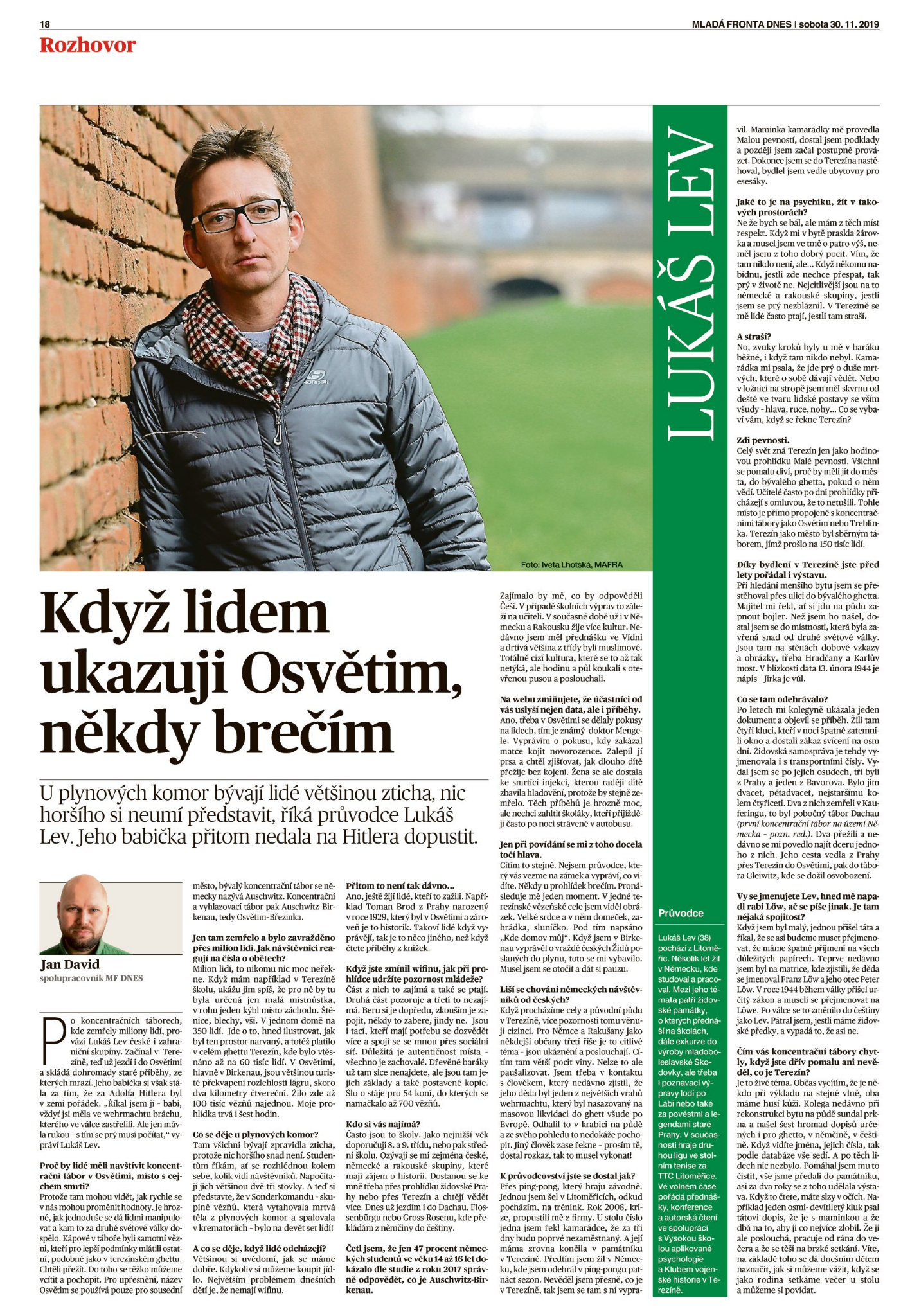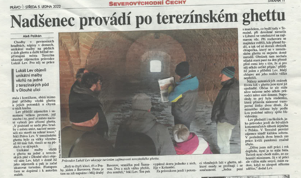 Jmenuji se Lukáš Lev a práce se stala mým koníčkem. Pracuji jako licencovaný průvodce. Během prohlídek Terezína si projdeme místa, kam se klasický návštěvník nemá šanci dostat. Dále přednáším na téma holocaustu po České republice, Rakousku nebo Německu. V Terezíně organizuji různé přednášky a konference (23.1-25.1.2026). Po pražském židovském ghettu dělám celodenní prohlídky s přednáškou o Terezíně. Dále celodenní prohlídky bývalých koncentračních táborů jako Osvětim či Gross-Rosen.