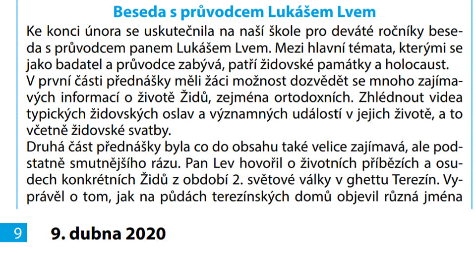 Nabízím základním a středním školám celodenní přednášku ve Vaší škole na téma: Judaismus, židovské zvyky, tradice, historie Terezína, nové nálezy, Osvětim, atd..